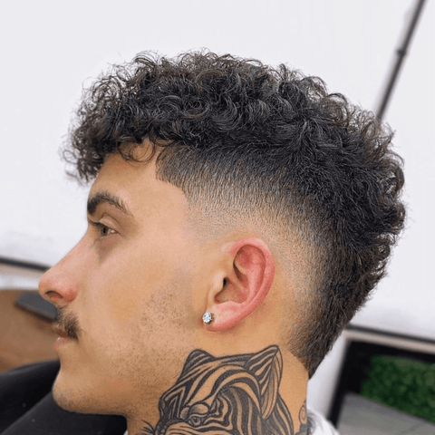 The Curly Burst Fade features a fade that radiates outwards from behind the ears, creating a burst effect. The curly hair on top is left longer, providing a contrast to the faded sides. This haircut is edgy and contemporary, perfect for men who want a modern look with a twist. The burst fade accentuates the curls, making them appear fuller and more defined.